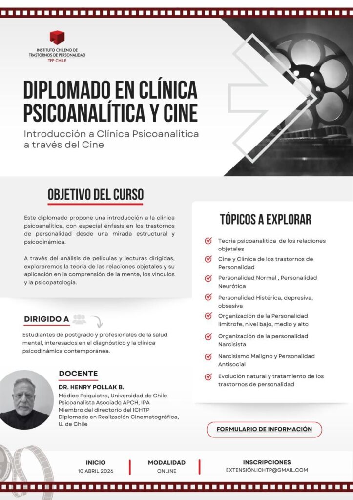 El Instituto Chileno de Trastornos de Personalidad invita a profesionales de la salud mental y estudiantes avanzados a participar en el Diplomado en Clínica Psicoanalítica y Cine, una propuesta formativa que articula el pensamiento psicoanalítico con el análisis cinematográfico como herramienta de comprensión clínica. El programa dará inicio el viernes 10 de abril de 2026, se desarrollará entre abril y julio, y contempla sesiones en horario de 19:00 a 20:30 horas. Esta instancia ofrece un espacio de profundización teórica y reflexión clínica orientado a enriquecer la mirada diagnóstica y terapéutica desde una perspectiva contemporánea.